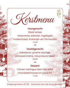 Wij zijn kerstavond en eerste kerstdag geopend. Op deze dagen serveren wij naast de kaart een speciaal driegangenmenu. De gerechten zijn ook los te bestellen.